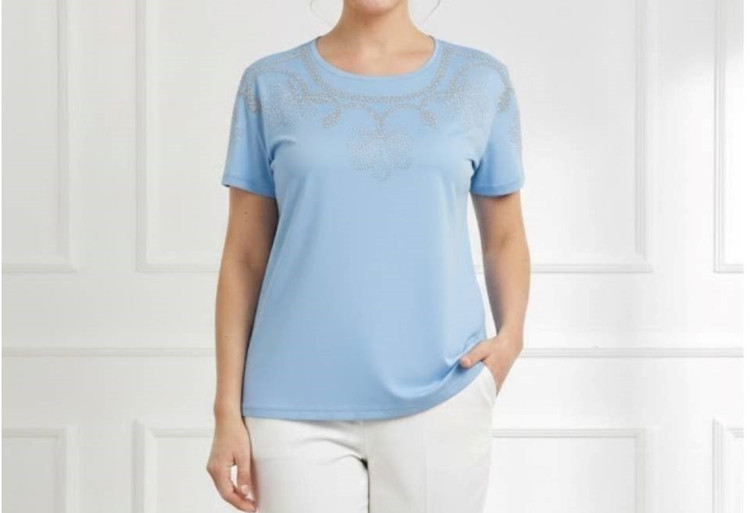 تیشرت آبی آسمانی با نگینهای درخشان سهگلی، ترکیبی از جذابیت و راحتی است که هر خانمی را به خود جذب میکند!